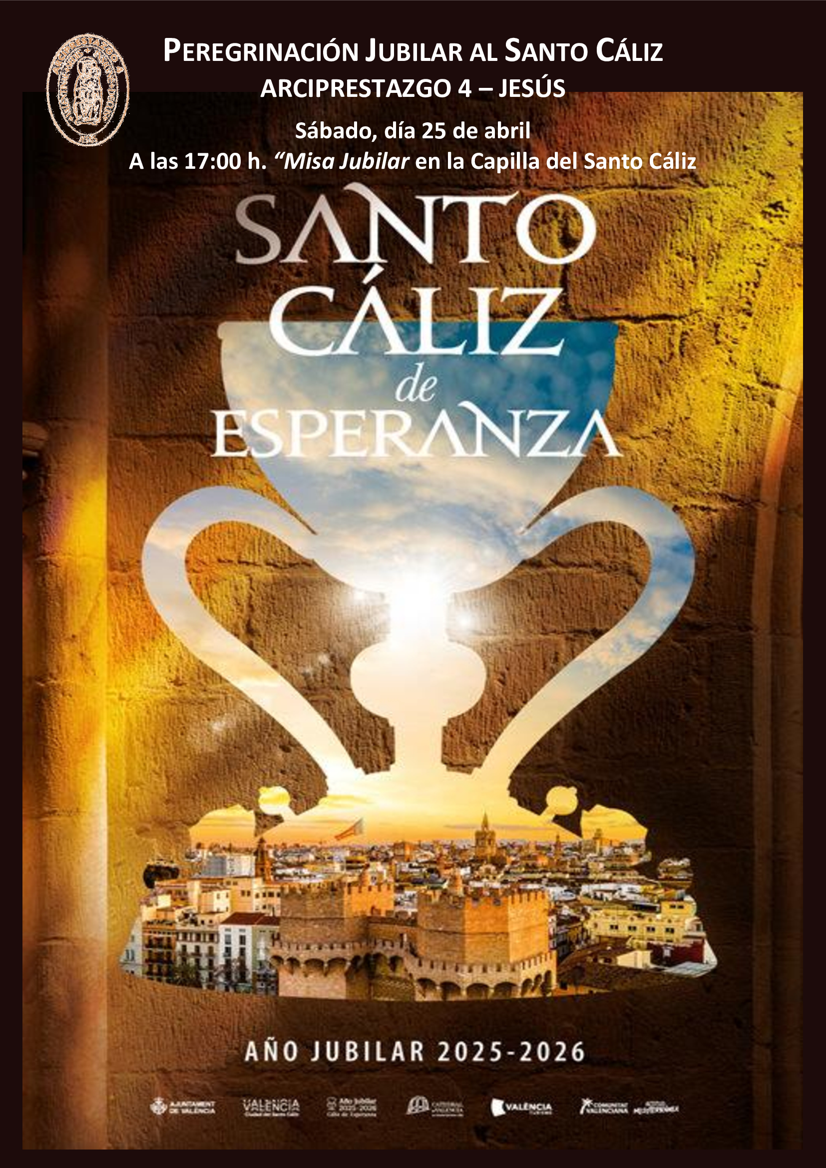 EL ARCIPRESTAZGO 4-JESÚS, AL QUE PERTENECE NUESTRA PARROQUIA, HA ORGANIZADO, DENTRO DE LAS CELEBRACIONES DEL AÑO JUBILAR DEL SANTO CÁLIZ 2025-2026, UNA “PEREGRINACIÓN JUBILAR AL SANTO CÁLIZ”, QUE TENDRÁ SU MÁXIMA EXPRESIÓN CON LA “MISA JUBILAR EN LA CAPILLA DEL SANTO CÁLIZ, QUE SE CELEBRARÁ EL SÁBADO 25 DE ABRIL A LAS 17 (diecisiete) HORAS”.
